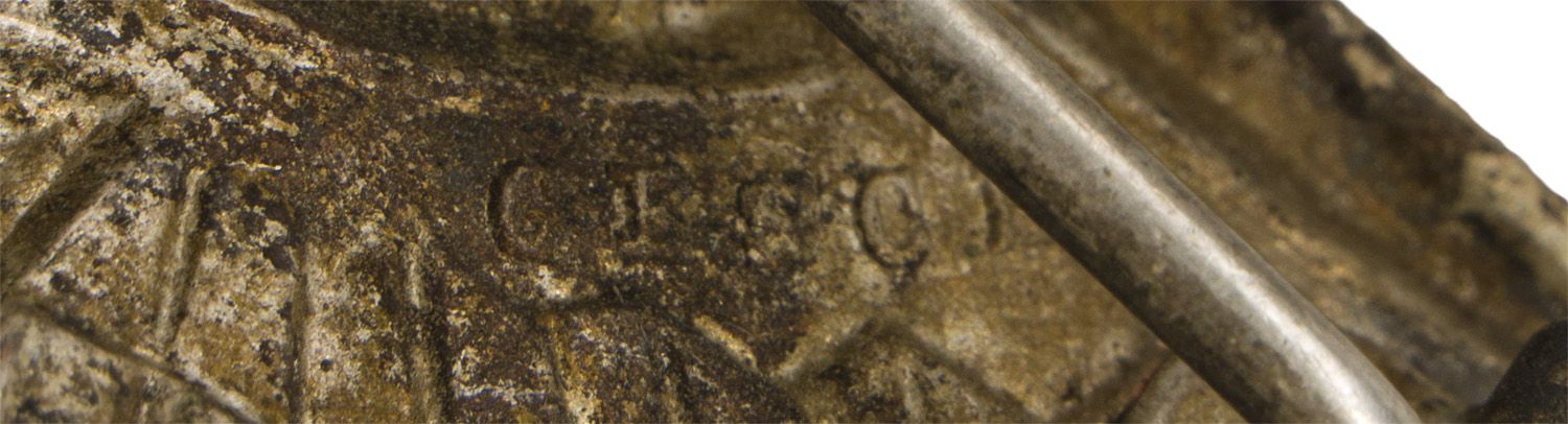 PHYSICAL DESCRIPTION: A stamped alloy, silver-washed eagle, whose spread wings have a span of 95mm, with a wreathed, mobile swastika in its talons, and a Iron Cross to its breast (with black painted center), behind which are crossed swords. A horizontal pin-back device, with a hinge and catch, is to its hollow-backed reverse. "Ges." is embossed to the reverse of one of the eagle's wings, and "Gesch.," to the other, for "Gesetzlich Geschützt" (By-law Protected). Fairly hard eagle to find.