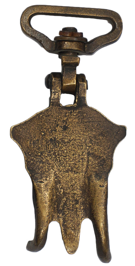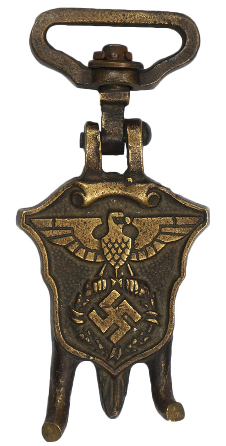 (Trommelschere)Small, cast brass, political style, drum hanger for the snare drum. Hanger is roughly 40mm wide, at its widest point and 98mm tall. Hanger is in the form of an ornate shield base with scalloped sides and a raised edge border, encompassing an embossed early pattern national eagle clutching a wreath with a canted swastika, on a pitted field. Bottom of hanger has two slightly angled, different sized, turned up carrying hooks, flanking a "feathered" centerpiece. Two extended arms to hanger top with lynch pin attached centerpiece with swivel topped attachment ring. No damage. A photographed example can be seen in J.R. Angolia’s book, The HJ volume 2, page 268, bottom right. (Ex Philippe Gillain Collection)