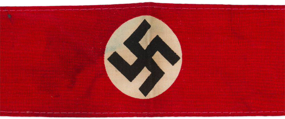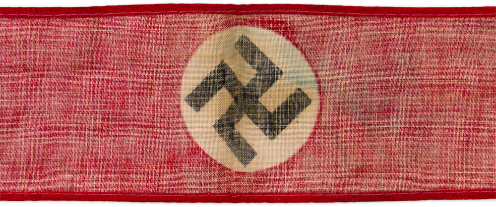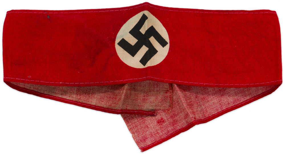 PHYSICAL DESCRIPTION: A 40cm x 52mm, printed cotton-rayon blend cuff band, whose red base is interrupted by a 40mm diameter white disk with a black, mobile swastika to it. Its upper and lower edges are folded back and sewn unto themselves to the reverse.