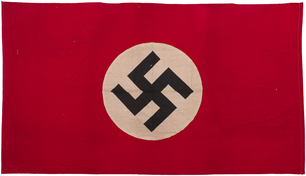 PHYSICAL DESCRIPTION: Multi-piece cotton construction banner approximately 135cm x 230cm. To both its red fields are sewn white disks, with a printed mobile swastikas in black. The tunnel loop is 3.5cm wide. Nice worn and used example showing the expected age and wear.