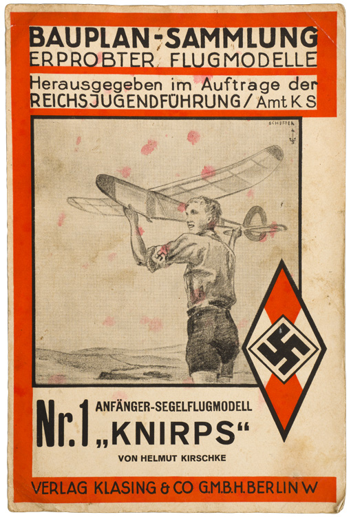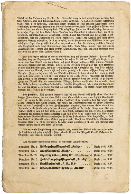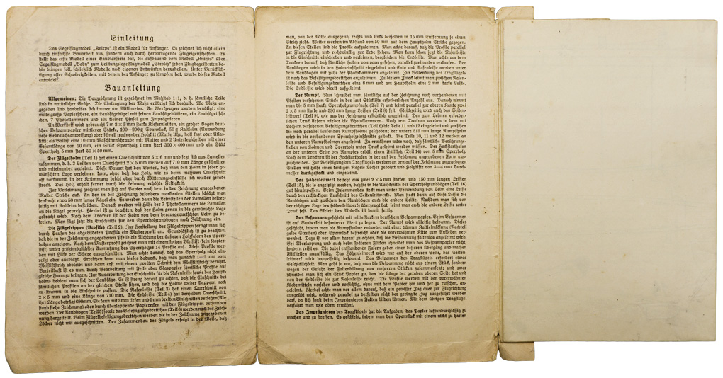 A 16cm x 23.5cm paper booklet that contain the fold out construction plans for "Beginner Glider Model No. 1 "Knirps". When the plans are opened, they measure approximately 86cm x 61cm.