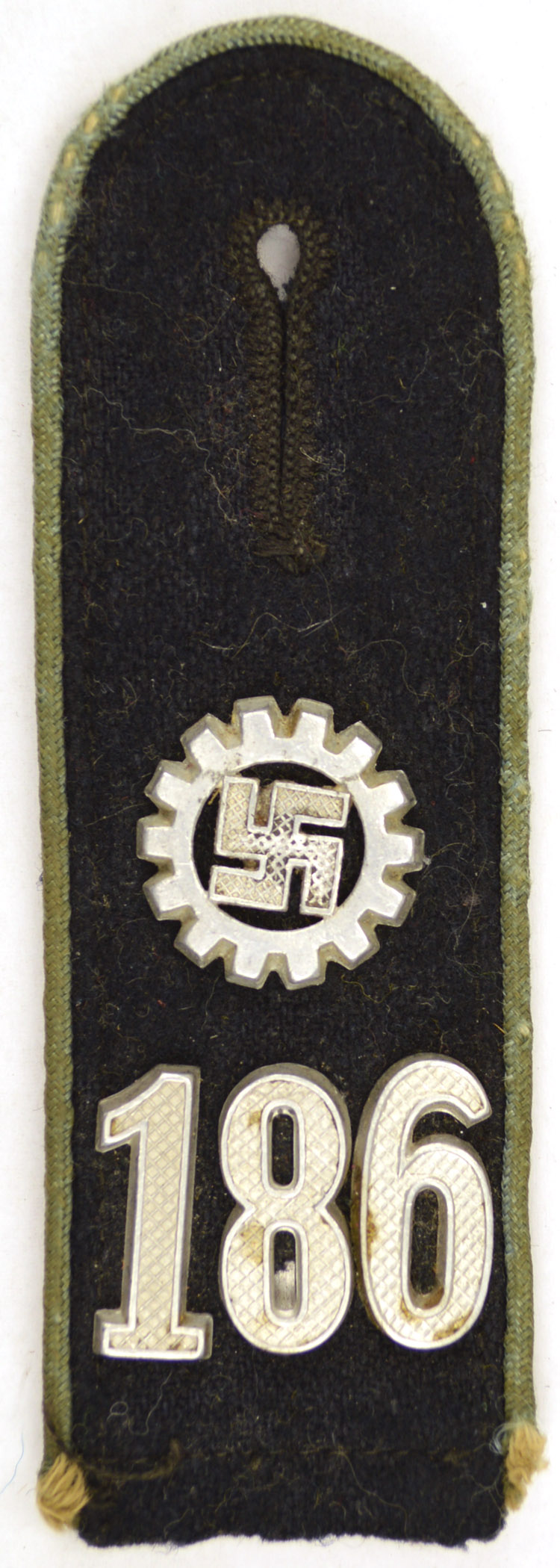 BACKGROUND: The Deutsche Arbeitsfront, (German Labor Front), originally founded in 1933, became an official NSDAP organization in October 1934. Its stated purpose was to educate the workers in industry and commerce for smooth and efficient operation of all labor in the Third Reich. The structure of the DAF was basically the same as the NSDAP with different political levels of organization. Due to the diversification in labor the DAF was divided into sub-sections for specific trades and/or professions and it also controlled the Kdf, Kraft durch Freude, (Strength through Joy), organization which provided recreation for workers. However the DAF’s most important goal was to enforce the political stability of the large mass of the work force. One of the sub-sections of the DAF was the DAF-Werkscharen, (DAF-Labor Squads). The Werkscharen were established in February 1935 and were to act as the NSDAP’s "watch-dog", in industrial factories. In June 1935 the Werkscharen were granted independent status and uniform regulations were enacted. In June 1937 the first pattern shoulder straps were introduced and were piped in the color of the appropriate political level.