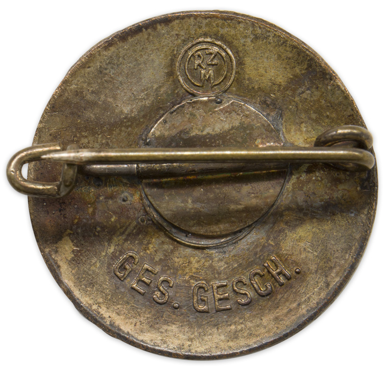 PHYSICAL DESCRIPTION: A 22mm diameter, convex, first pattern Hitler Youth member's pin, in silver washed alloy with enamel work. To its obverse, circular center is the image of a sun rising from a black enamel horizon, against a translucent, red enamel sky, with a partial, black enamel, mobile swastika to the sun itself. "H.J." and "Deutsche Arbeiter-Jugend" (German Worker-Youth), in black enamel, is to the surround encircling the image. A horizontal pin-back device is crimped to a plate brazed to its concave reverse. Marked RZM & "Ges. Gesch." (for "Gesetzlich Geschützt," or, By-law Protected).