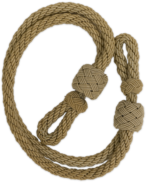 Golden yellow (sun faded), twisted celleon chin cord. Measures 30cm from button hole center to button hole center.