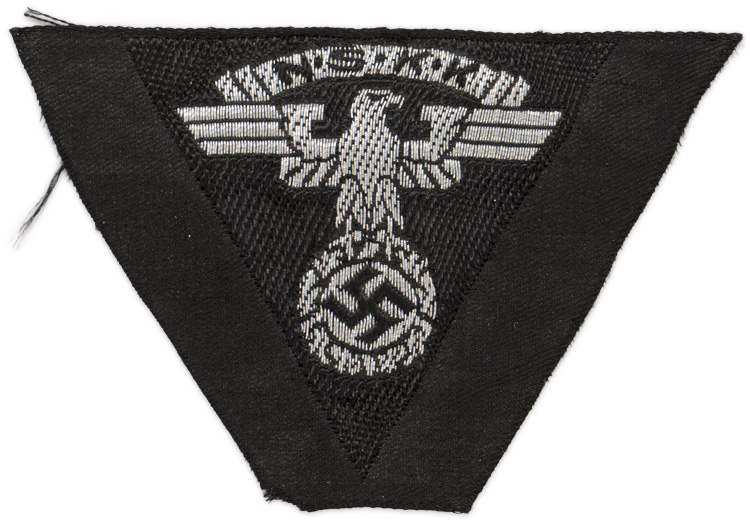 PHYSICAL DESCRIPTION: A machine woven, first pattern (1935-39) NSKK eagle and swastika, with a banner arching above upon which is "N.S.K.K.," all in silver wire with black accents, on a black, inverted triangular rayon base. The insignia is still on its original black rayon factory roll. The color black signified wear by Motor-Brigade Westfalen or Motor-Gruppe Neiderrhein. Mint unissued.
