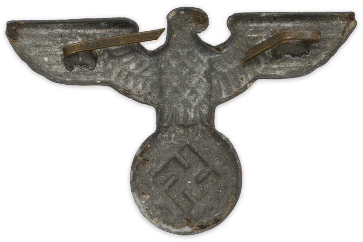 PHYSICAL DESCRIPTION: 1936 pattern, die stamped, zinc construction national eagle clutching an oak-leaf wreath which encompasses an embossed, canted swastika on a slightly pebbled, recessed background field. The left facing eagle features extended, wing tips with a roughly 55mm wingspan. Reverse of the eagle is a mirror image of the obverse. Two original attachment prongs are intact.