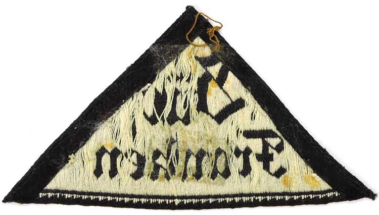 PHYSICAL DESCRIPTION: A woven black rayon constructed isosceles triangle featuring machine woven Gothic script in two lines, "Süd Franken", in silver/grey threads. The triangle also has a narrow machine woven silver/grey border stripe near the outside edges. The triangle has a small section of its original black rayon factory roll folded and machine stitched to the reverse.
