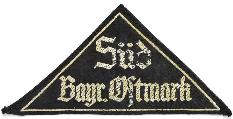 PHYSICAL DESCRIPTION: Black rayon construction isosceles triangle with a machine woven Gothic script in two lines, "Südost Bayr.Ostmark" in grey to its interior. The reverse of the has it original paper HJ RZM tag still in place.