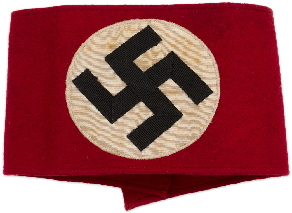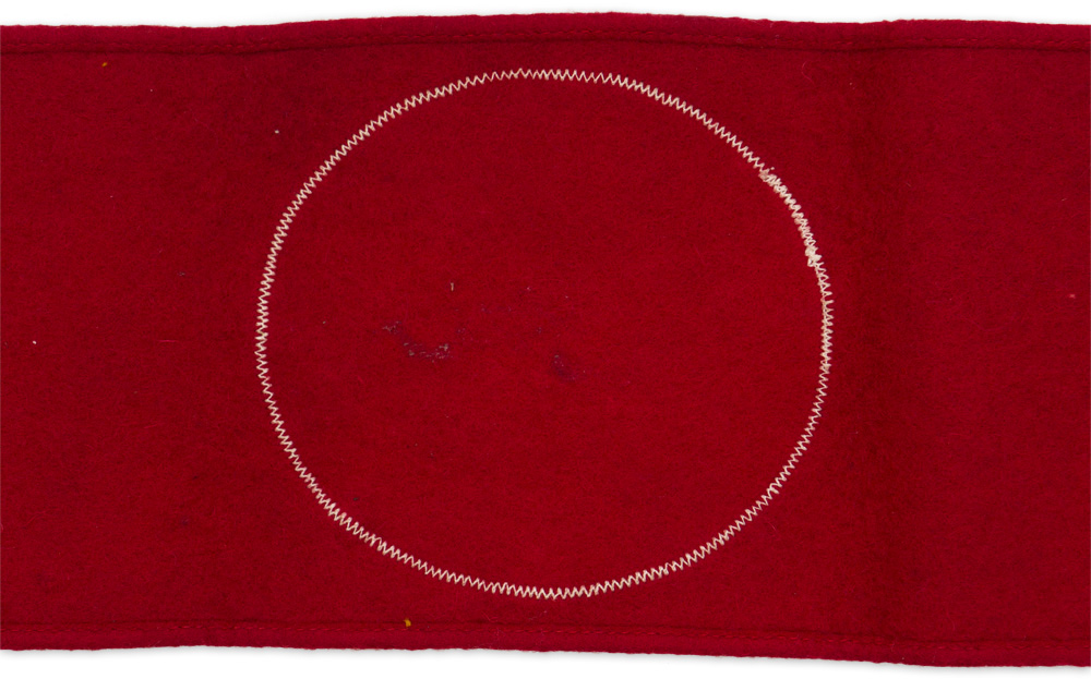 PHYSICAL DESCRIPTION: Red wool armband, upon which is sewn a white disk, with a separate black mobile swastika sewn to it. Couple of small moth holes. Nice early production example,