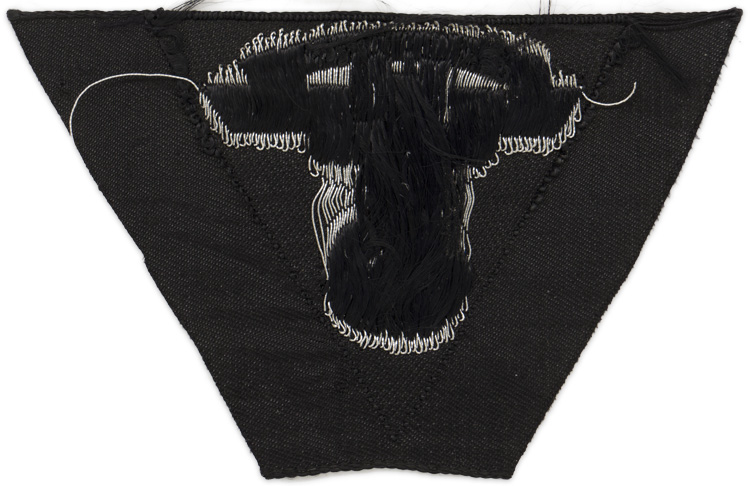 PHYSICAL DESCRIPTION: A machine woven, first pattern (1935-39) NSKK eagle and swastika, with a banner arching above upon which is "N.S.K.K.," all in silver wire with black accents, on a black, inverted triangular rayon base. The insignia is still on its original black rayon factory roll. The color black signified wear by Motor-Brigade Westfalen or Motor-Gruppe Neiderrhein. Mint unissued.