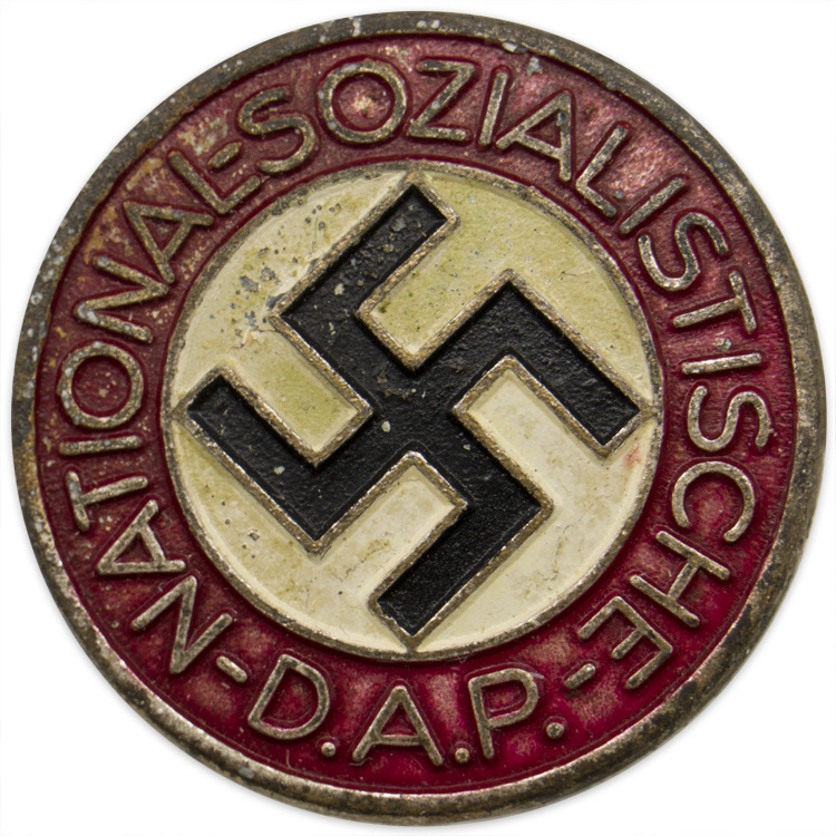 PHYSICAL DESCRIPTION: A 24mm diameter, die struck metal and painted NSDAP member’s badge. The badge features a red outer border, edged in silver, with the silver script, "National-Sozialistische-D.A.P.," encompassing a white field with a black mobile swastika, also edged in silver. To the reverse is crimped a horizontal pin-back device, above which is embossed the "RZM" logo, and beneath which is embossed the manufacturer’s code, "M1/63" for Steinhauer & Lück, Lüdenscheid.