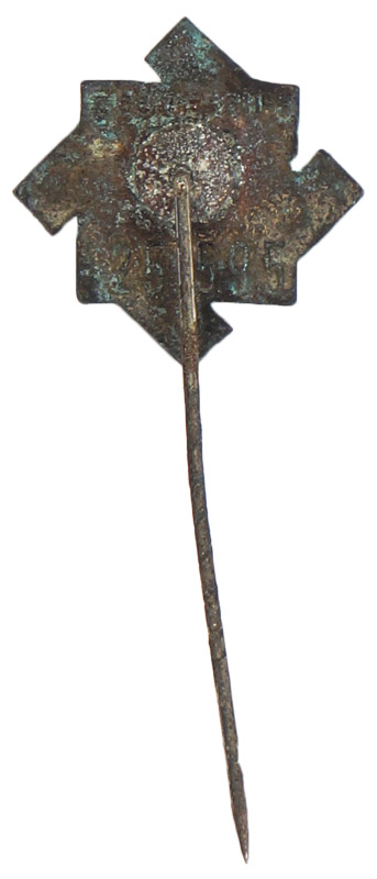 PHYSICAL DESCRIPTION: A 22mm alloy and enamel lapel pin in the form of a black mobile swastika, on a red square base, with a fifteen cogged wheel to the center of the swastika, enclosing a stylized "TN". To the reverse is the 45mm rifled stick pin, above which is embossed "Ges. Gesch." (patent pending). Membership number is stamped below. Scarce.