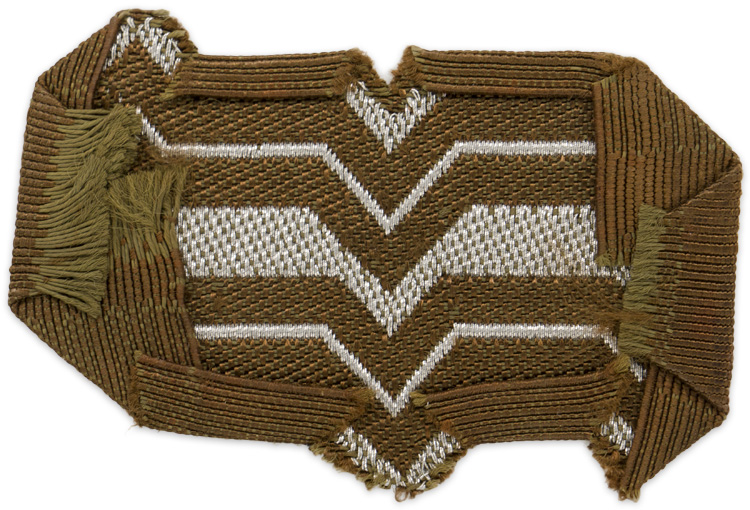 PHYSICAL DESCRIPTION: A third pattern (1943) right collar patch, in the form of two, machine woven angular bars, in silver-grey, on a medium brown rayon base. The edges of the base have been folded inwards to its featureless reverse. Some light wear may be seen to its edges, perhaps where it was removed from a uniform, and there is very light age soiling throughout. The mirror image of this would have been worn on the left collar of the tunic or greatcoat, and together they were known as "Wehrbau-Abzeichen" (Defence Construction Badges). Worn by the ranks of "OT-Oberbauführer," "OT-Oberfrontführer," and "OT-Oberarzt."