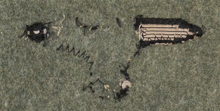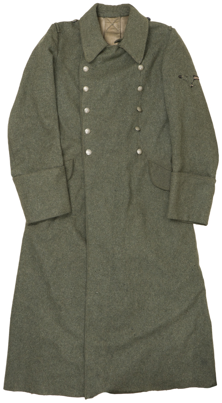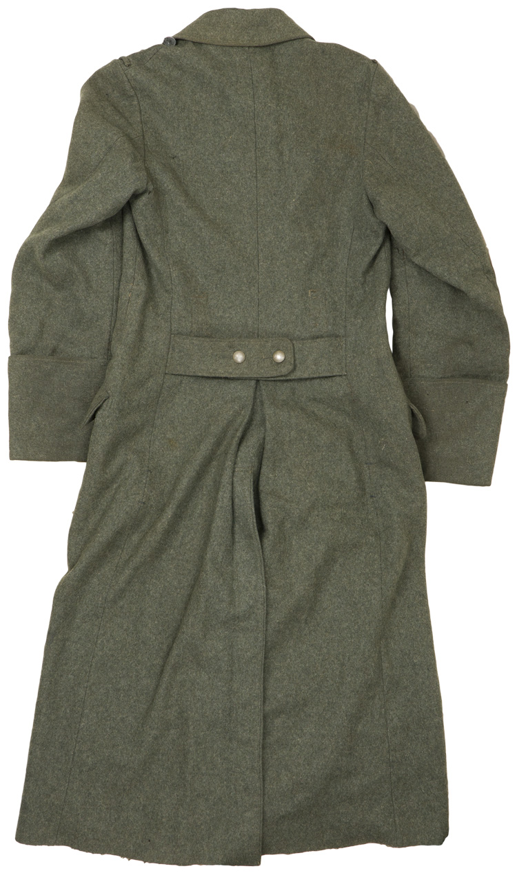 PHYSICAL DESCRIPTION: Heavy, field-grey wool/rayon blend, full length, double breasted style greatcoat that features dual, vertical, parallel, rows of six front closure buttons with corresponding button holes on the left front panel, and a single button hole on the right front panel. The greatcoat has small fold back lapels and a single metal hook and eye at the neck. The coat has two, diagonally angled, slash hip pockets with straight edged flaps. To the upper left sleeve is a machine woven SS sleeve eagle which is machine sewn on. Only portions of the eagles wings now remain. The reverse of the surcoat has a central, vertical tail skirt vent with a four button closure. The shoulder strap fabric retaining loops and buttons are intact. The coat has a large, field-grey, lay down collar with a single button and an extended field-grey wool tab under the left side and a single corresponding button under the right side for a secure neck closure in inclement weather. The collar has no collar tabs as regulations of June 1ST 1942, abolished them for wear by enlisted ranks on the greatcoat. Buttons are a combination of original and replaced stitching. Coat has it original size and makers markings. Roughly a size 36" chest. A few scattered moth holes. Shows the expected period use and wear but overall nice condition.
