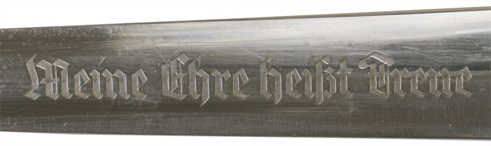 BACKGROUND: The SS M33 service dagger was introduced on December 15TH 1933 for wear by all full SS members, regardless of rank. The dagger was intended as an ornamental item and the design was based on the traditional 16TH century Swiss "Holbein" hunting dagger as was being utilized for the SA personnel’s dagger with a different coloration and insignia. The daggers were bestowed annually to newly accepted SS members at 10:00pm on the anniversary of the unsuccessful Beer Hall Putsch, (November 9TH), in front of the Feldherrnhalle in Munich. Originally the daggers featured an anodized scabbard and utilized nice quality solid nickel/silver fittings until roughly early 1937 when the scabbards began to have a painted finish and cheaper nickel/silver plated fittings replaced the earlier solid nickel/silver fittings in 1938. Of Note: During the course of the Third Reich there were five distinct SS daggers introduced starting with the M33 dagger in 1933, the Röhm inscription, the Himmler dedication and the SS Honor dagger in 1934 and the M36 dagger in August 1936.