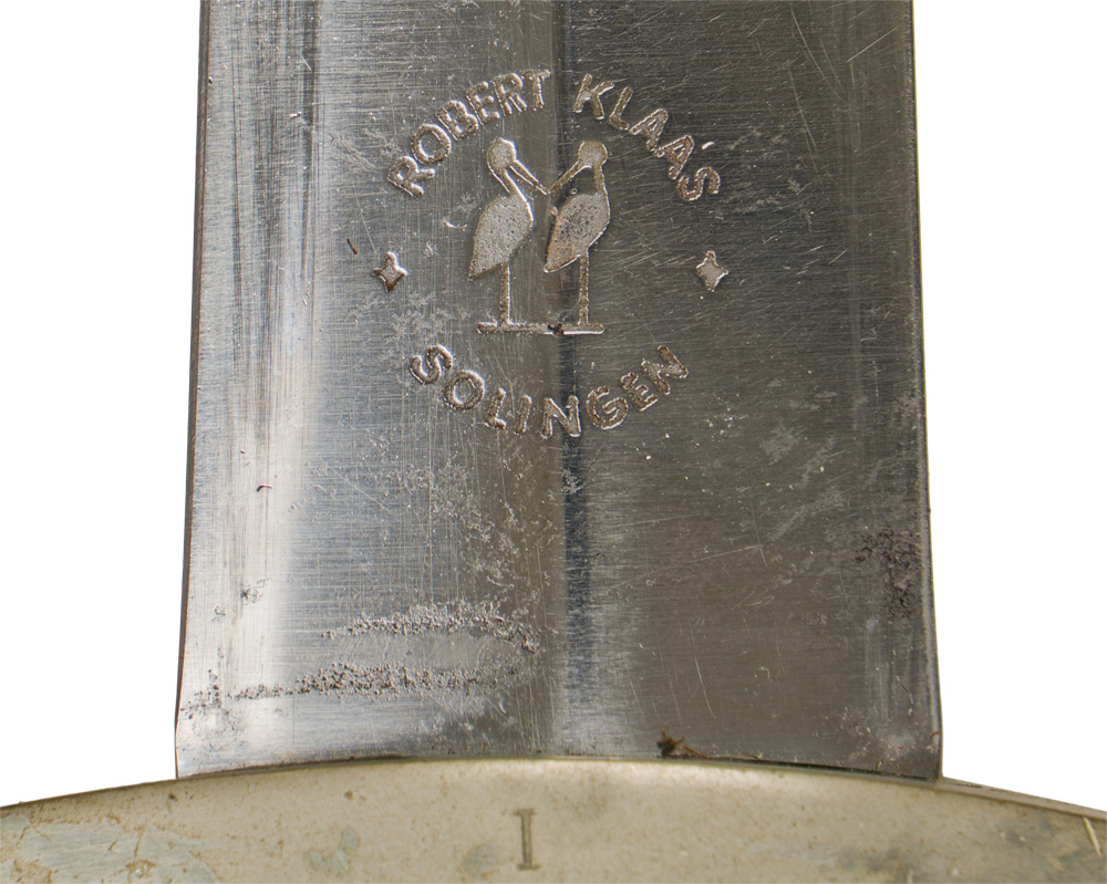 PHYSICAL DESCRIPTION: Early, (circa 1933-37), nice quality dagger features a roughly 22cm long, double edged, drop forged steel, nickel/silver plated blade with a low central ridge. The nickel/silver plated blade shows minor scabbard runners and surface spotting but is still quite clean and bright with most of the original cross graining still being visible. The obverse of the blade has a nice, deep, well defined acid etched motto, "Meine Ehre Heißt Treue", (My Honor is Loyalty). The reverse of the blade has a well defined acid etched manufacturers logo, name and location. The logo consists of two kissing swans encompassed by script, "Robert Klaas Solingen. The dagger comes with a nickel/silver cross guard, pommel and tang nut and a carved ebony grip. The reverse of the cross guard is well marked with stamped Roman numeral, "I". The nicely shaped ebony grip has a nice snug fit to the cross guard and pommel fittings. There is a chip to the top reverse grip. The grip has a flush, inset, solid nickel/silver national eagle and nickel/silver and enameled SS button nicely fit in place. The dagger comes with a black anodized, magnetic sheet metal scabbard with solid nickel/silver fittings. The solid nickel/silver top and bottom fittings both show the same light, consistently even age toned patina as on the cross guard, pommel and tang nut. The top scabbard fitting retains both of its dome headed retaining screws and the hanger suspension ring and loop. Nice untouched SS dagger. The original hanger is included, but is broken.