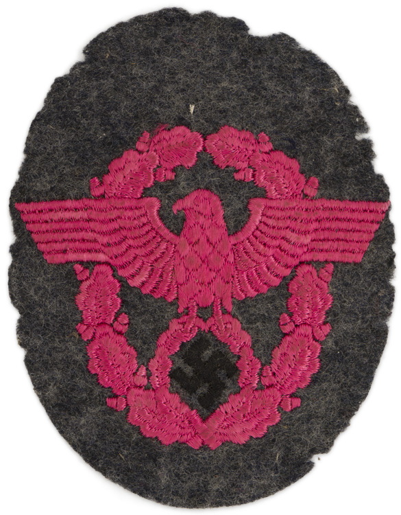 PHYSICAL DESCRIPTION: Machine embroidered police eagle encompassed by a vertically oval oak-leaf wreath in carmine truppenfarbe, (branch of service color), cotton threads with black swastika detailing, mounted on a roughly, 95mm tall and 75mm wide, vertically oval, Luftwaffe blue/grey wool base. The eagles wings extending beyond the edges of the oval oak-leaf wreath with a roughly, 70mm wingspan. The insignia shows light to moderate age and usage toning and the wool base shows some tracking. Looks to have been removed from a uniform. Scarce eagle.