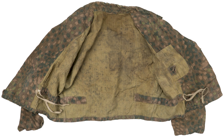 PHYSICAL DESCRIPTION: Cotton/rayon blend material construction, waist length, double breasted, panzer wrap style tunic with fold back lapels and a lay down collar. The tunic has an HBT weave and the machine roller printed Dot pattern camouflage to the exterior in shades of tans, browns and greens. The vertical front closure has four hidden button holes on the lower left side and an additional three visible button holes on the left lapel. The right side of the vertical closure has seven corresponding, vertically aligned, molded black bakelite buttons. The left closure panel overlaps the right closure panel when buttoned. The interior left closure panel has two, extended, horizontal, button holed, fabric tabs with two corresponding black bakelite buttons to the interior of the right closure panel. The tunic also has a single metal hook and eye at the neckline for secure closure in inclement weather. The lower body of the tunic has small, dual, stitched, tapering darts to both the obverse and reverse. The tunic has straight cut, dual ply hemmed, non adjustable sleeves. The interior front closure panels are partially lined in the camouflage fabric with a horizontal slash patch pocket to the left breast panel. The interior of the tunic has a horizontal stitched strip of fabric to either side of the waist line with tunnel looped, fabric tape, fit adjustment drawstrings. The tunic has no visible markings. The tunic is roughly a size 40" chest.