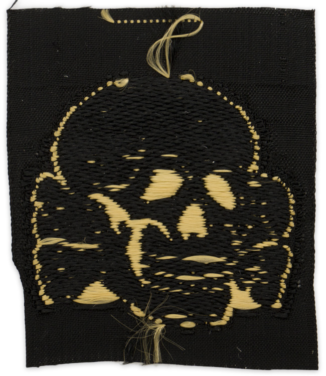 PHYSICAL DESCRIPTION: BeVo, machine woven skull and cross bones in golden/tan rayon threads with black accent threads on a woven, black, rayon base. The skull features a bottom jaw, dual rows of teeth and nice eye, nose and cranium detailing. The skull is roughly, 35mm tall and 35mm wide at its widest point. The skull is still on its original, black, rayon factory roll and is in overall excellent, un-issued condition with minimal age toning. Nice!