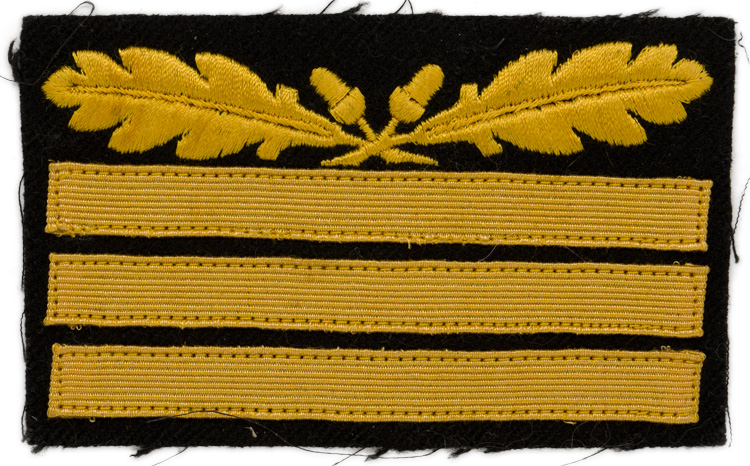 PHYSICAL DESCRIPTION: Machine embroidered insignia feature triple gold horizontal bars positioned below dual horizontal oak-leaves with two acorns, on a black wool base.