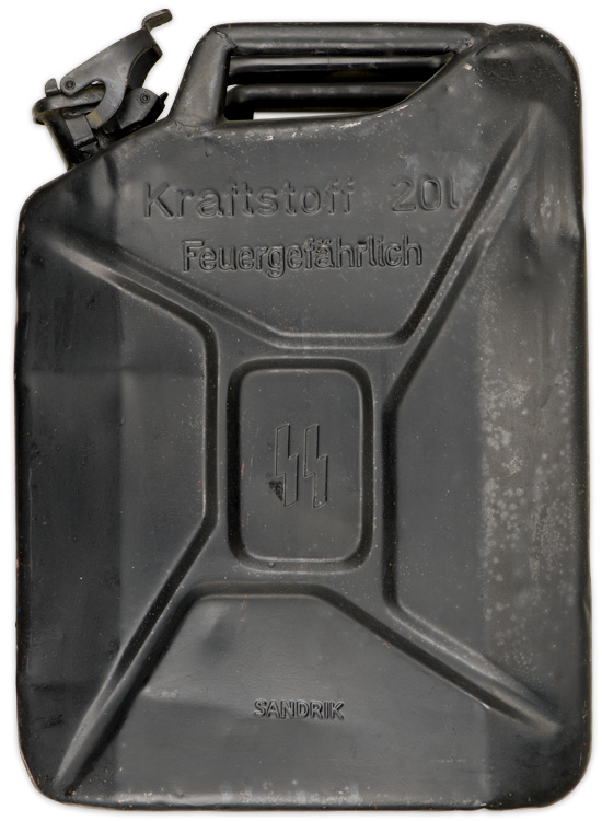 PHYSICAL DESCRIPTION: Roughly, 47cm tall, 35cm wide and 14cm deep, magnetic sheet metal construction gasoline can with three, horizontal, welded, tubular handles and a raised, pour spout to the top edge. The top edge has dual, downward diagonally angled, "steps", resulting in the pouring spout being positioned lower then the carrying handles. Each side of the can has a large, impressed, strength reinforcing and gas expansion, stylized "X". The can was constructed of two halves and has a central, recessed, vertical, seam with a raised, welded bead. The pouring spout has a hinged cap with dual, extended, locking arms which slide into two, raised, welded, retaining loops. The interior pouring spout rubber seal is still intact. The top interior of the pouring spout has the addition of a hollow, air access tube to facilitate ease of pouring. The can has deeply stamped script to one side which includes, "Kraftstoff 20l Feuergefährlich", (Fuel 20 liters, Highly Combustible), and the SS runes. The can also has the stamped manufacturer’s name, "Sandrik". Shows the expected age, period use and wear. The can is in overall good condition with a couple of small dings and dents and has been over-painted in black.