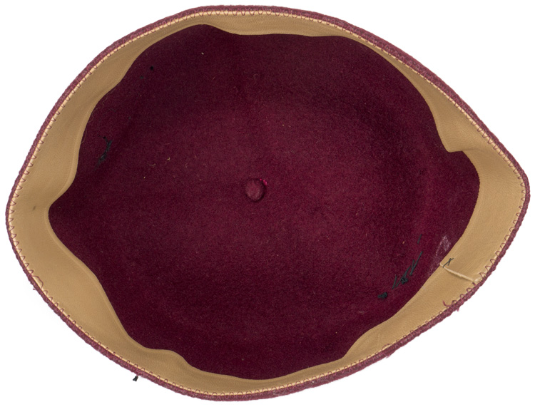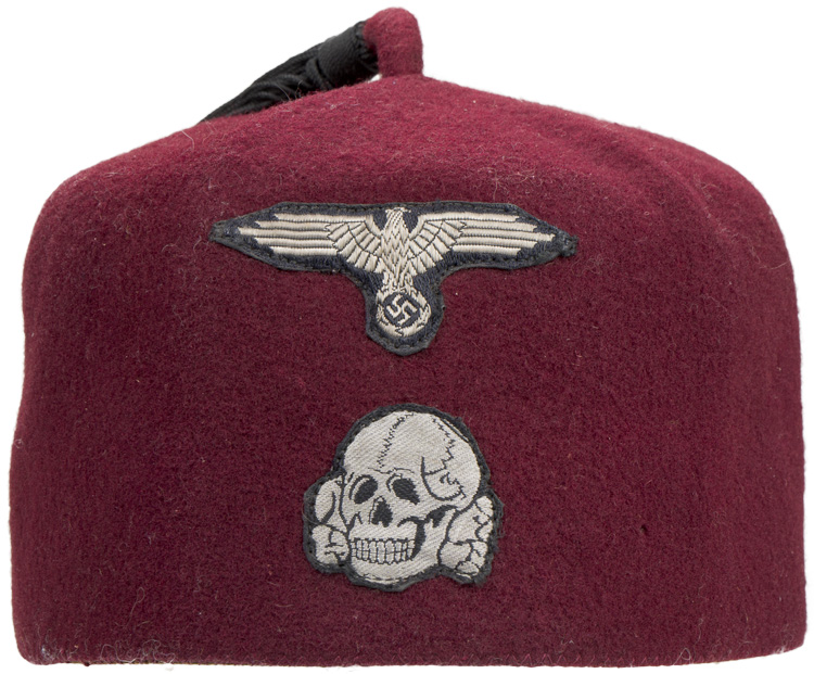 PHYSICAL DESCRIPTION: Nice quality, formed, maroon, rabbit fur felt, construction dress uniform fez. The fez features a two piece tassel to the top center of the crown. The tassel has a short piece of maroon felt inserted and stitched into the center of the crown with the correct, black, multi strand, silk type material tassel sewn to the top. The front center of the fez features a machine woven, second pattern, SS eagle in silver/grey threads on a cut out woven black rayon base and a separate machine woven, 1934 pattern, Totenkopf in silver/grey threads, also on a cut out black rayon base. Both pieces of insignia are machine stitched to the cap. The unlined interior has a leather sweatband machine stitched to the bottom edge. Size marked 57. Excellent untouched example.