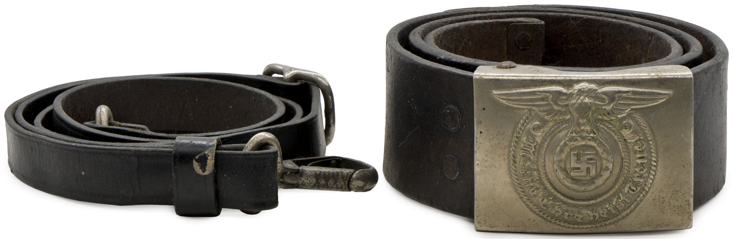 PHYSICAL DESCRIPTION: Early, (circa 1932 1934), die stamped, solid nickel/silver construction, box belt buckle features a smooth, outer field with a high relief, embossed, central motif pattern consisting of an SS style national eagle with out stretched wings, clutching a wreath, encompassing a static swastika. The swastika and wreath are in turn encompassed by a circular, simulated, twisted rope border with the Gothic script motto, "Meine Ehre heißt Treue!", (My Honour is Loyalty!). The script is situated on a subtly textured background field and is encircled by the inner and the outer simulated twisted rope borders. The reverse of the buckle is a mirror image of the obverse and the brazed buckle catch, prong bar and prongs are all intact. The reverse of the buckle is also well marked with the stamped manufacturer’s initials, "O&C", indicating manufacture by Overhoff & Cie of Lüdenscheid and "ges. gesch.", indicating, Gesetzlich Geschützt, (Protected by Law). The buckle is in overall very good condition with light age patina. Comes with an original 84cm long leather belt. Stitching on the size adjustment tab has let go, and the tab has been riveted to the belt (done a long time ago, may be period). Also included is a nice period shoulder strap. There are no D-rings with the set.