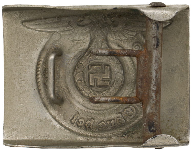 BACKGROUND: The Allgemeine SS, (General SS), was originally formed in May 1923 under the auspices of the SA, Sturm Abteilung, (Storm/Assault Detachment), as the Stosstrupp Adolf Hitler (Shock Troops), and was redesignated Schutz Staffel, (Protection Squad), in April 1925 with the official acceptance of the name verified on the second anniversary of the failed Munich "Beer Hall" Putsch on November 9TH 1925. As a subordinate unit to the SA, early SS personnel wore the standard SA style box belt buckle. It is believed that Adolf Hitler personally designed a new pattern box belt buckle specifically for wear by SS EM/NCO personnel with the manufacturing patent being originally granted to the Overhoff & Cie. firm in Lüdenscheid. This new style buckle was adopted for wear by EM/NCO personnel in late 1931 or early 1932. Generally the early buckles were produced in solid nickel/silver until sometime in 1936 when aluminum alloys replaced the nickel/silver versions. In 1940 the EM/NCO's belt buckles began to be manufactured in steel replacing the aluminum alloy buckles. Of Note: The RZM, Reichzeugmeisterei, (National Equipment Quartermaster), was officially founded in June 1934 in Munich by the NSDAP, Nationalsozialistische Deutsche Arbeiterpartei, (National Socialist German Worker's Party), as a Reich Hauptamt, (State Central Office), and was based on the earlier SA Quartermaster's Department. The functions of the RZM were not only to procure and distribute items to Party formations, but also to approve chosen designs and to act as a quality control supervisor to ensure items manufactured for the Party met required specification and were standardized. Starting in late 1934 items manufactured for the SS came under the quality control of the RZM and as a result were to be marked with the RZM/SS approval/acceptance mark. In 1943 the Waffen SS, (Armed SS), assumed full control over their uniform item production and no longer fell under the authority of the RZM.