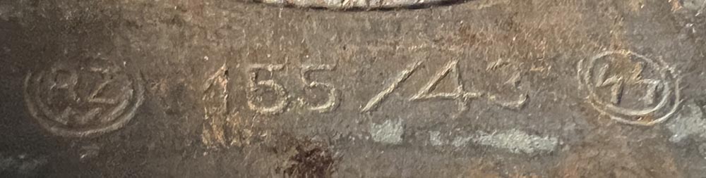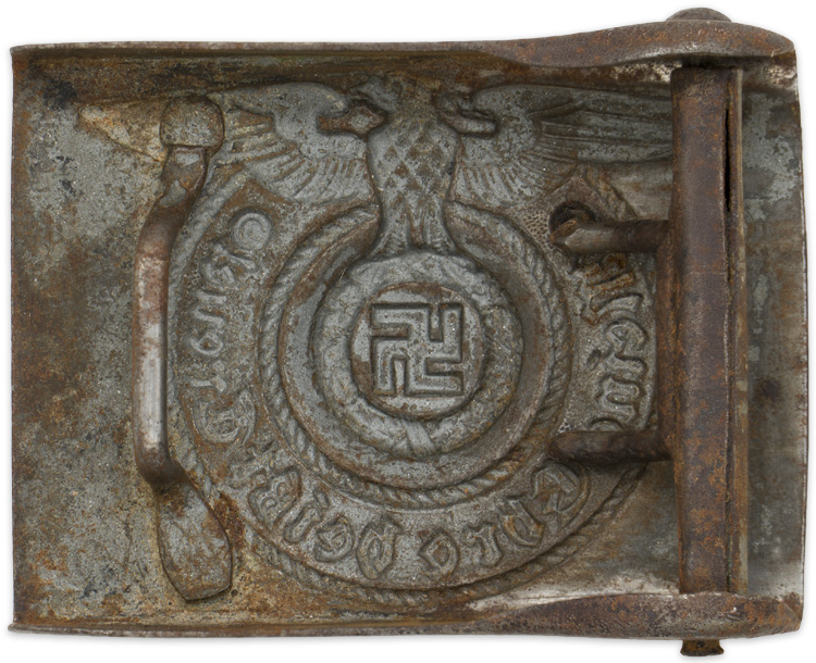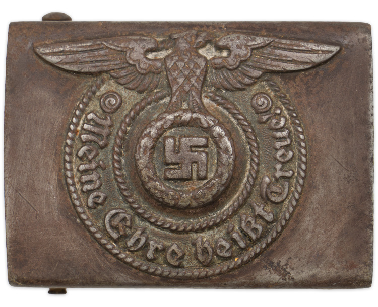 PHYSICAL DESCRIPTION: Stamped steel construction, standard pattern, box buckle with a matte grey painted finish. The obverse of the buckle features a smooth outer field with a high relief, embossed central motif consisting of an SS style national eagle with out stretched wings, clutching a wreath encompassing a static swastika. The swastika and wreath are in turn encompassed by a circular simulated twisted rope border with Gothic script motto, "Meine Ehre heißt Treue!", (My Honour is Loyalty!). The script is situated on a subtly textured background field and is encircled by the inner and an outer simulated twisted rope borders. The reverse of the buckle is a mirror image of the obverse and has the brazed buckle catch, prong bar and prongs all intact. The reverse of the buckle is well marked with the very faint, just visible, impressed RZM logo and SS runes flanking the manufacturers contract code number and date "155/43" indicating manufacture by F.W. Assmann & Söhne of Lüdenscheid in 1943. Nice worn and used example. Comes with a nice 85cm tropical belt with two tropical D-rings.