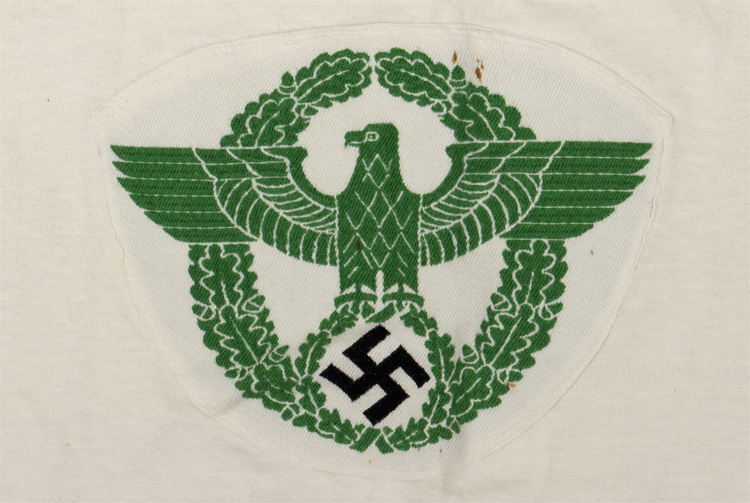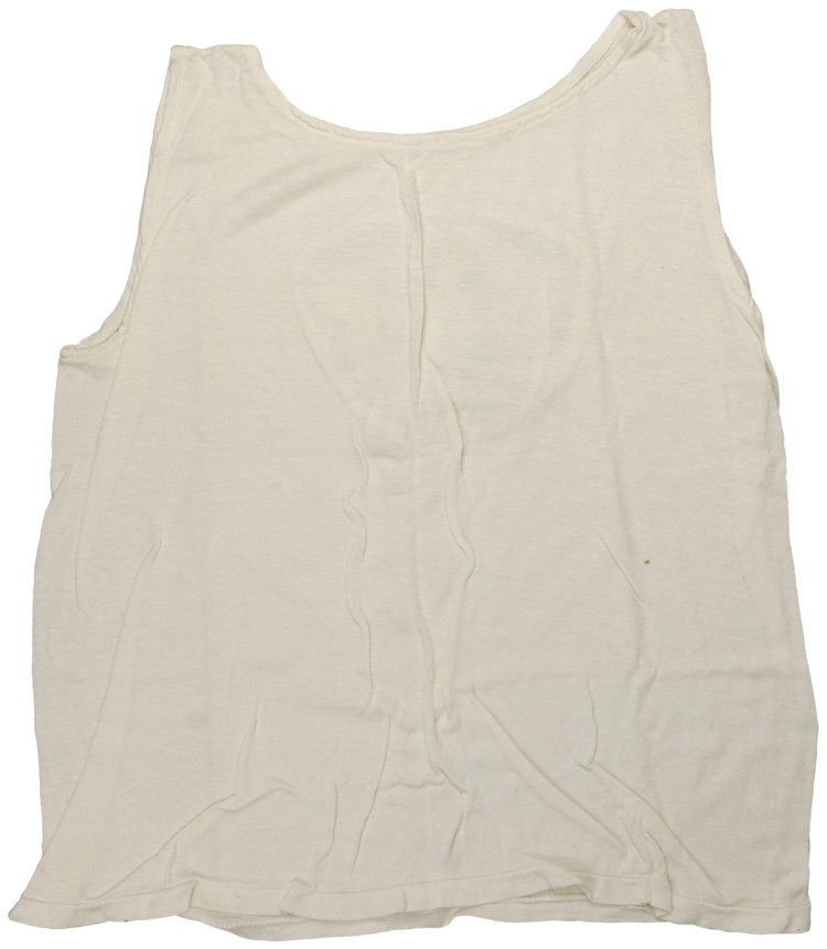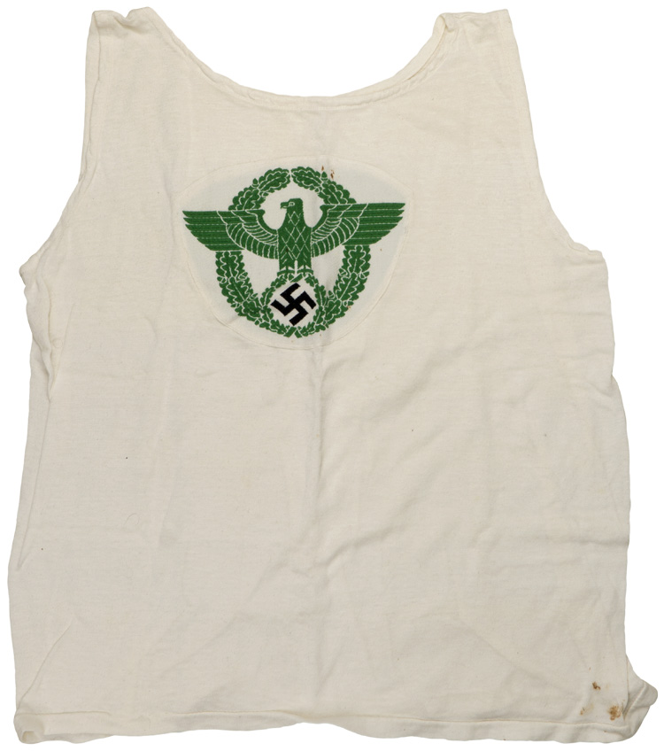 Stretchy, standard issue, white tricot construction, tank top style, sports shirt with vertical side seams and low, circular, boat-cut neck line. Shirt has a machine woven polizei emblem to the front. Shirt is roughly size 36" (96cm) chest. Nice shirt.