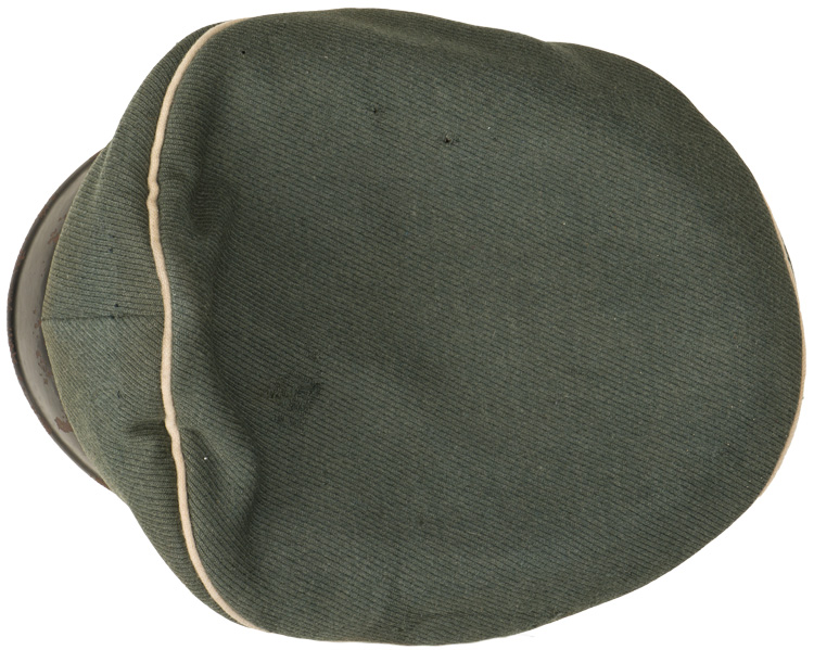 PHYSICAL DESCRIPTION: Issue type, field-grey wool/tricot blend construction, visor cap with a pronounced whipcord weave features a wide, black wool centerband and white wool piping to the top of the crown edge and both the top and bottom edges of the centerband. Cap original had a metal cap skull and cloth eagle, both of which have been removed. This one looks like it was work with-out a chinstrap, which was common during the war. The cap has a extended, forward, black lacquered, vulcanfibre visor with a subtly raised lip near the forward edge and an orangish/ tan bottom with a repeating cross-hatched pattern. The interior of the cap is fully lined with two grades of orangish/tan cloth lining. Sweat diamond is now missing. The interior of the cap also has a leather sweatband which is all complete (couple of small tears). Roughly a size 55/56. Shows the expected period use and wear but overall nice condition.