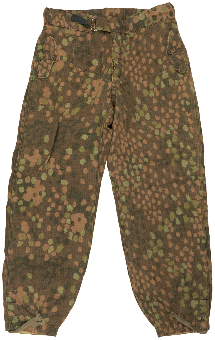 BACKGROUND: The development of SS camouflage items was initiated by Reichsführer-SS Heinrich Himmler in 1935 when he tasked the Reichsführung-SS, (National Leadership of the SS), to begin research of new camouflage patterns and garments for use by the fledgling SS-VT, SS-Verfugüngstruppe, (SS-Special Purpose Troops). In late 1936 and early 1937 the first SS camouflage garments were issued to personnel of the SS-VT Standarte Deutschland for field testing and evaluation. The first items evaluated were the Quarter shelters/ponchos, followed by steel helmet covers, face masks and smocks. As the war continued various other clothing items were produced in the assorted camouflage patterns. Originally the camouflage patterns were all produced in the time consuming manual screen printing until the development of the machine roller printing in 1940. By the end of the war no fewer then ten assorted camouflage patterns had been developed and used by the SS. The M44 dot pattern camouflage field blouse and trousers were officially introduced for Infantry personnel on March 1ST 1944 as a cost saving measure, and were designed to serve double duty by replacing both the drill uniform and camouflage smock. It is believed that the distinctive panzer wrap tunic and pants were also introduced and manufactured in the M44 dot pattern camouflage at about the same time as the Infantry models. The two piece M44 dot pattern camouflage uniforms for panzer personnel were intended to replace the cumbersome, panzer camouflage coveralls. Originally the early models of the M44 dot pattern camouflage uniforms were manufactured from stockpiles of dual sided, camouflage material with an HBT, (Herring Bone Twill), weave and the field blouse came outfitted with shoulder strap retaining loops and buttons and a factory applied sleeve eagle. By July 1944 the inclusion of the shoulder strap retaining loops and buttons and the factory applied sleeve eagle were discontinued. The M44 dot pattern camouflage uniform was only suitable for warm climates and regulations dictated that the uniforms were to be returned to the units storage depots annually on November 1ST although the lack of supplies negated this directive and the uniforms were worn through-out the year. Of Note: The panzer personnel M44 dot pattern camouflage pants differed slightly from the cut of the M44 drill uniform pants. The main differences include the addition of pocket flaps and an integral belt and the lack of belt loops.