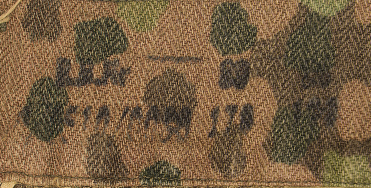 PHYSICAL DESCRIPTION: Cotton/rayon blend construction "Keilhose" style pants with an HBT, (Herring Bone Twill), weave and machine roller printed Dot pattern camouflage to the exterior. The camouflage pattern has a predominately mid-tan base with random dots in assorted shades of greens and tans. The pants feature a vertical, four button French fly with an additional two buttons at the waistband. The horizontal waistband has an integral, tunnel looped canvas belt with an HBT weave and a corresponding open rectangle, triple claw, magnetic sheet metal belt buckle. The belt extrudes through a vertical slash on the right side of the fly while the corresponding belt buckle is situated to the left side of the fly and secured by a fold back button holed tab with a corresponding button. The pants have two, slightly diagonally angled, vertical slash front pockets with scalloped button down flaps. The right front of the pants also has a horizontal, patch, watch pocket positioned just below waistband. The cuffs each have a vertical outside seam slash with a single button closure. Buttons all appear to have their original stitching. The pants are roughly size 32" waist. Faint marking.