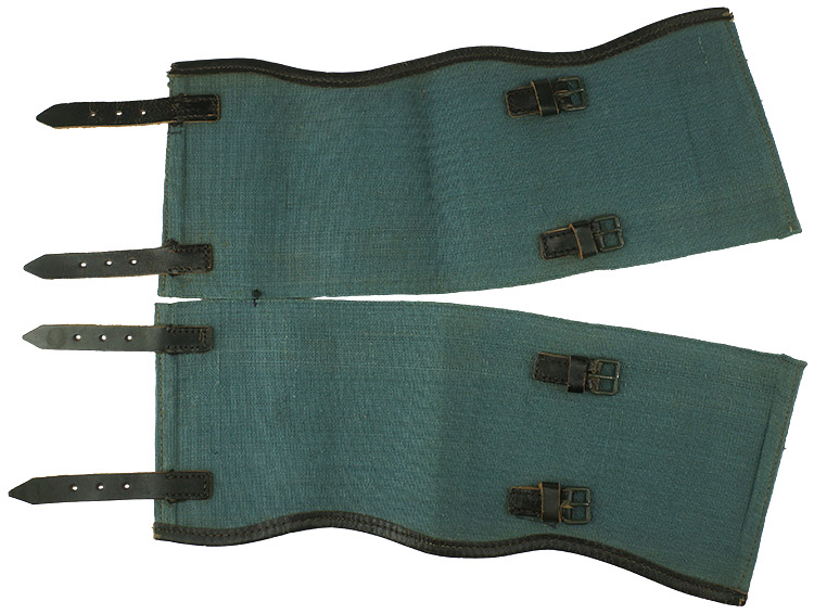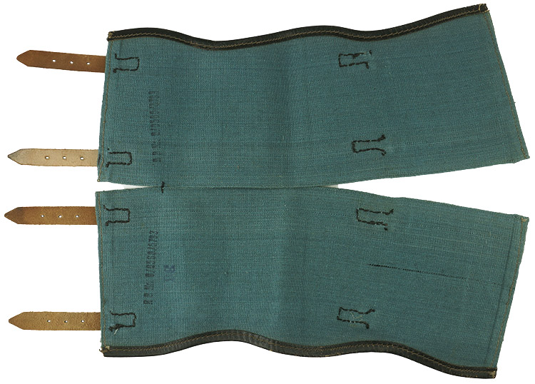 PHYSICAL DESCRIPTION: Dual-ply, police green canvas construction gaiters with machine stitched edges, black leather and steel fittings. The gaiters have straight cut top edges with two subtle curves to the bottom edges to accommodate the foot when worn. The bottom edges of the gaiters are trimmed with a narrow reinforcing strip of blackened leather. One end of each gaiter has a horizontal blackened leather buckling strap near both the top and bottom edges with three length adjustment holes with corresponding, leather reinforced, magnetic sheet metal pronged roller buckles to the other ends. One end of each gaiter is well marked with a black RB# inkstamp. Of Note: The RB numbers, Reichsbetriebnummer, (National factory code numbers), were introduced in late 1942 and were intended to replace the manufacturers marks on garments and equipment to conceal the manufactures name and location from the allies, to prevent bombing raids on German industrial factories. Still attached together with original factory string. Nice!!!