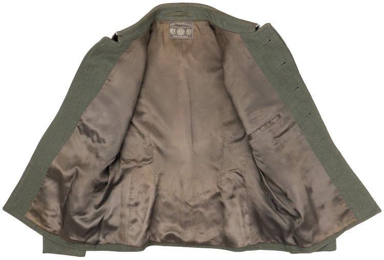 PHYSICAL DESCRIPTION: Exceedingly rare SS Litewka tunic of high quality gabardine material with typical closed collar, fly-front, and slash bottom pockets. The tunic has SS-Gruppenfuhrer shoulder boards with silver & gold entwined braids on off white/grey wool backings. Each shoulder board has a single rank pip. The collar has it original pair of SS-Gruppenfuhrer post-1942 style collar tabs. The collar complete with silver-aluminum edge piping. The left sleeve complete with an SS silver bullion wire arm eagle. Complete original liner. There is a Stuttgart maker label and also original name tag. Tag has has the family name removed/cut out. All original application to the insignia. Chest size is roughly a 36". Vendor reports the tunic came from a veteran's family member from the late 90s. Insanely rare SS tunic would be the centerpiece of any advanced WW2 collection!