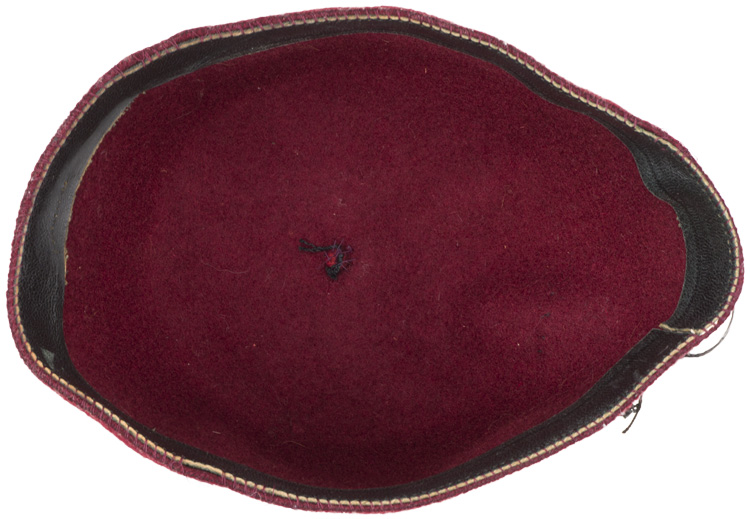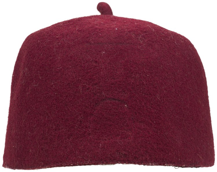 PHYSICAL DESCRIPTION: Nice quality, formed, maroon, rabbit fur felt, construction dress uniform fez. The fez features a two piece tassel to the top center of the crown. The tassel has a short piece of maroon felt inserted and stitched into the center of the crown with the correct, black, multi-strand, silk type material tassel sewn to the top. Insignia removed. The unlined interior has a full remaining leather sweatband machine stitched to the bottom edge. Roughly a size 54/55.
