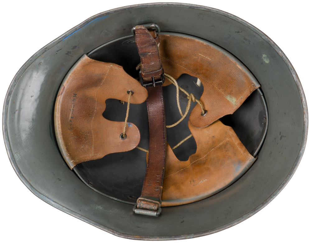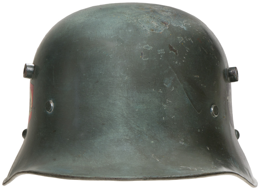 PHYSICAL DESCRIPTION: The heavy, stamped, sheet steel construction M16, style, helmet retains about most of its transitional, field-grey over-paint. The left side of the helmet has a black based, silver, wreathed, police eagle decal which is retained about 90%. Under the wing of the eagle can be seen the typicaly attachment hole for the Austrian insignia. The right side of the helmet has a NSDAP party shield decal with a narrow black outer border, a red base field with a central, white, circle with a canted, black, swastika. The party shield decal is retained about 95%. All three liner retaining rivets, both of the extended, M16/M18 style, ventilation side lugs and both of the large, dome headed, chinstrap, retaining rivets are all intact. Complete with original three pad leather liner. Original chinstrap. Nice large size, about 60 head size. Textbook Austrian transitional!