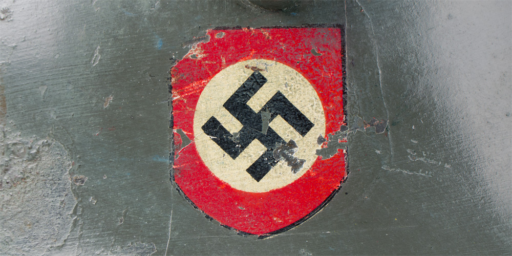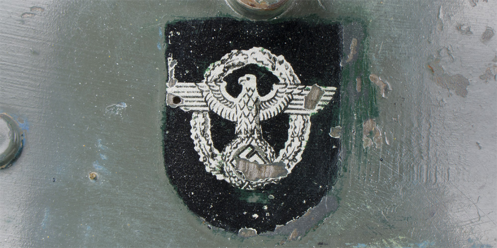 BACKGROUND: The first "modern" steel helmets were introduced by the French army in early 1915 and were shortly followed by the British army later that year. With plans on the drawing board, experimental helmets in the field, ("Gaede" helmet), and some captured French and British helmets the German army began tests for their own steel helmet at the Kummersdorf Proving Grounds in November, and in the field in December 1915. An acceptable pattern was developed and approved and production began at Eisen-und Hüttenwerke, AG Thale/Harz, in the spring of 1916. These first modern M16 helmets evolved into the M18 helmets by the end of WWI. The M16 and M18 helmets remained in usage through-out the Weimar Reichswehr era and on into the early years of the Third Reich until the development of the smaller, lighter M35 style helmet in June 1935. In an effort to reduced construction time and labor costs minor modifications were introduced in March 1940 resulting in the M40 helmet. Further construction modifications were undertaken in August 1942 resulting in the M42 helmet. Beside the basic army style helmets the Germans also produced a wide variety of civic style helmets with no fewer then nine assorted variants of the model M34. These civic style helmets were utilized by assorted civilian and para-military organizations including the police. Shortly after Adolf Hitler’s ascension to power on January 30TH 1933 the independent Prussian state police introduced new helmet insignia in an attempt at creating uniformity in dress. The new helmet insignia consisted of a small, canted, white, swastika positioned on the right side and the Prussian state shield in black and white positioned diagonally on the left side. This insignia was utilized until April 23RD 1934 when new insignia for all of German police agencies was introduced that consisted of a small, canted, white, swastika positioned on the right side and the German national tri-color shield in black, white and red positioned diagonally on the left side. This second pattern insignia was only utilized until July 11TH 1934 when a third pattern insignia was introduced that consisted of a larger, canted, white, swastika positioned on the right side and a slightly modified German national tri-color shield in black, white and red positioned diagonally on the left side. This third pattern was utilized until a fourth and final pattern was introduced on July 28TH 1936. With Reichsführer-SS Heinrich Himmler’s appointment to Chef der Deutschen Polizei im Reichsministerium des Innern, on June 17TH 1936, he effectively had full control of all the police agencies within Germany. As a result of this appointment and the restructuring of all the separate German state police into a single national police force new regulations were instituted to bring about uniformity in dress for all police through-out the country. The new dress regulations included an attempt to standardize the helmets of the police and on July 28TH 1936 regulations once again altered the insignia on the police helmets with the new wreathed police eagle emblem to be applied to the left side of the helmet and the NSDAP party shield applied to the right side. The July 1936 police helmet insignia was utilized for the duration of the war.