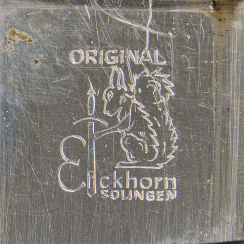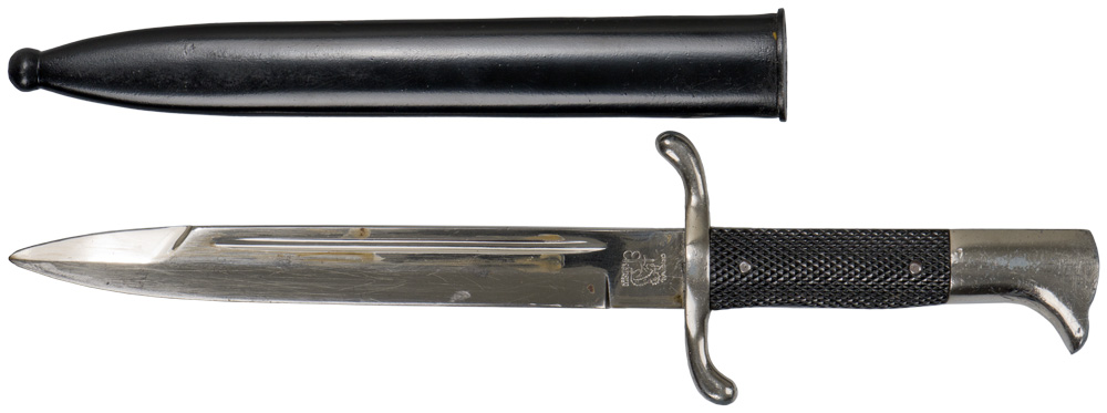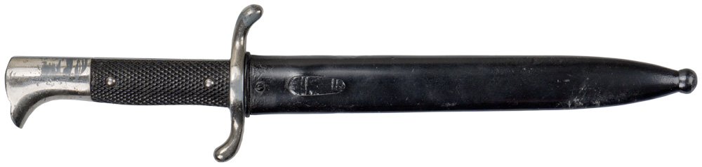 PHYSICAL DESCRIPTION: Roughly, 20cm long, nickel/silver plated, drop forged steel construction blade with a wide fuller to each side and a forward swedge. The reverse ricasso is well marked with the acid etched manufacturer’s logo, script, name, and location, consisting of a seated squirrel clutching a downward pointing sword with the name and location, "Carl Eickhorn Solingen", positioned beneath the squirrel and the script, "Original", positioned above the squirrel. Of Note: This version of Eickhorn’s logo was utilized circa 1935 1941. The leather washer is missing. The hilt consists of a nickel/silver plated, alloy cross guard, a stylized eagle head pommel and molded black bakelite grips with a repeating, grooved, diamond pattern. Complete with original scabbard. Scabbard my be refinished? These officer examples are harder to find.