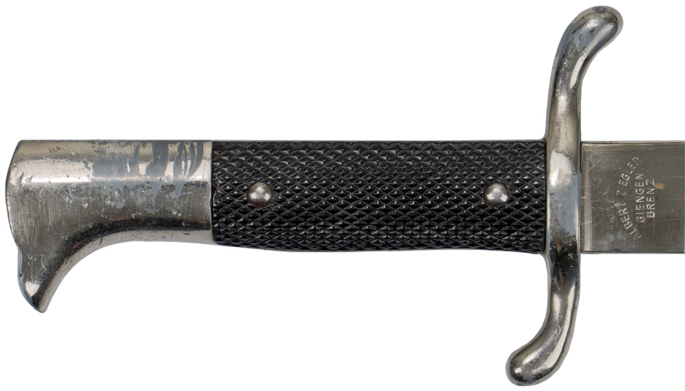 BACKGROUND: As with all Police agencies in Germany during the Third Reich the FschP. Feuerschutzpolizei, (Fire Protection Police), came under the auspices of Reichsführer SS Heinrich Himmler in his position as Chef der Deutschen Polizei im Reichsministerium des Innern, (Chief of the German Police in the National Ministry of the Interior), effective on June 17TH 1936. Newly introduced regulations in July 1936 attempted to bring about uniformity in dress for all Feuerschutzpolizei and also established standardized side arms that included the dress bayonet. The dress bayonets were manufactured with an assortment of minor optional variations with a long model, (9 7/8"), blade for NCO personnel and a shorter, (7 7/8"), blade for Officers. The longer model dress bayonet was intended for wear by ranks of FschP Feuerwehrmann through to FschP Brandmeister while the shorter model was intended for wear by ranks of FschP Oberbrandmeister through to FschP Hauptbrandmeister. When utilized the dress bayonets were outfitted with a leather frog and a decorative portepee to be suspended from the left hand side of the load carrying waist belt. The portepees, (sword/bayonet knots), were originally introduced in the Prussian army in 1808, and continued to be worn with the Dress uniform, as a tradition and identifying item through WWI, the Weimar Republic, (Circa 1919 1933), and on into the Third Reich, with minor modifications. Originally designed as a functional item to secure the blade sidearm to the holders wrist the troddels and portepees evolved into a purely decorative accessory.