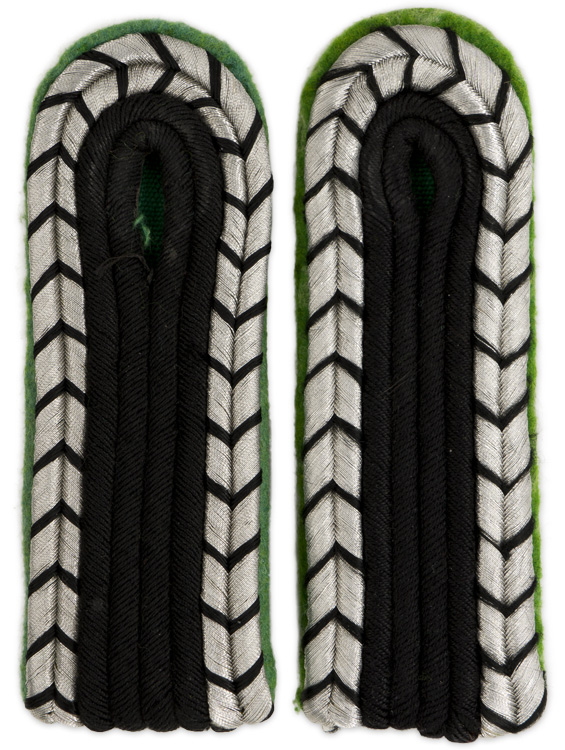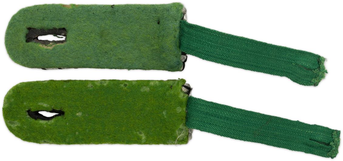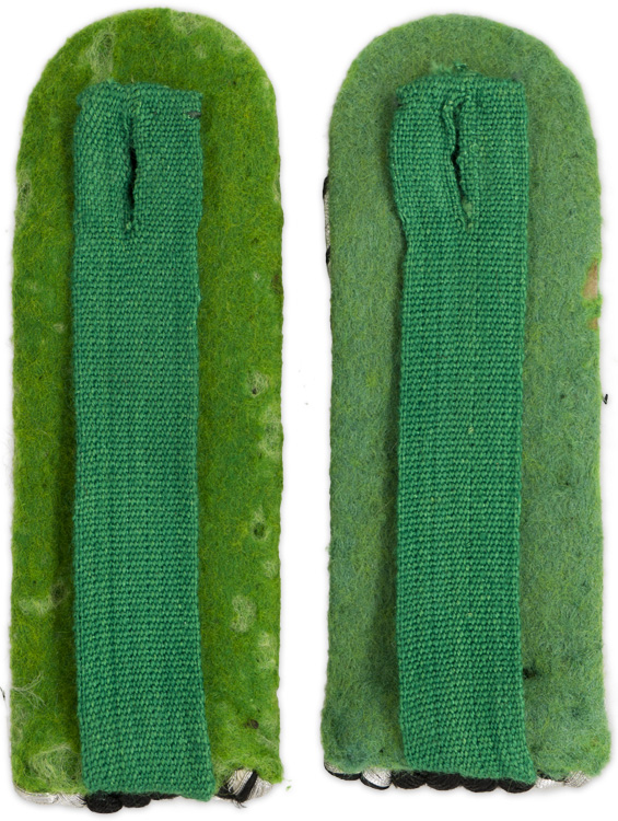 PHYSICAL DESCRIPTION: 1942 Pattern slip on examples. The shoulder boards feature dual, outer edge, matte silver/aluminum Russian braid with evenly spaced, interwoven black "V"s, encompassing dual, inner, black braids, mounted on a green wool truppenfarbe base. Rank of Unterscharführer.