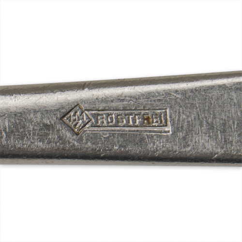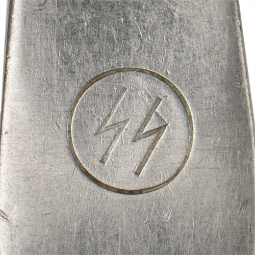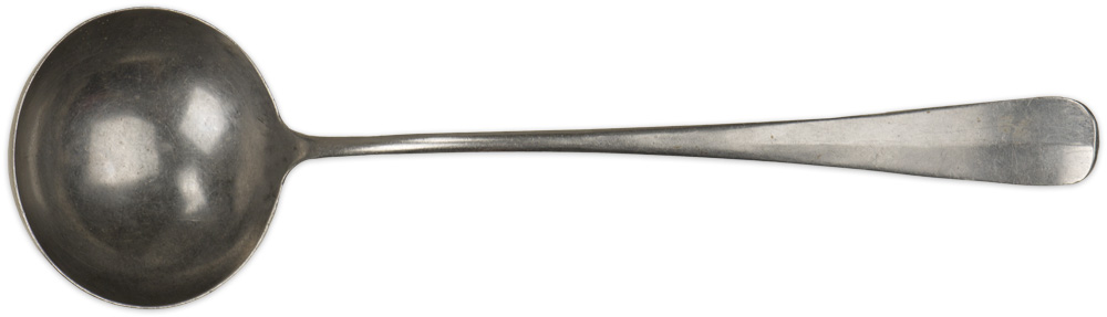 Large one piece, stainless steel construction mess hall/galley serving ladle that measures approximately 33.5cm in overall length. The front of the handle has a central, raised, rib while the reverse of the handle is well marked with "SS" within a circle. It is also marked "Rostfrie".
