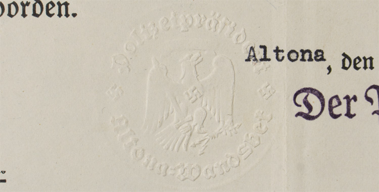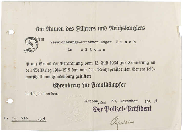to the insurance director Edgar Busch in Altona by virtue of the decree of July 13, 1934, commemorating the World War 1914/1918, the Cross of Honor for Frontline Fighters, established by the Reich President Field Marshal von Hindenburg, is awarded.” The award shows edge wear with some tearing. Appropriate embossed stamp and signature present.