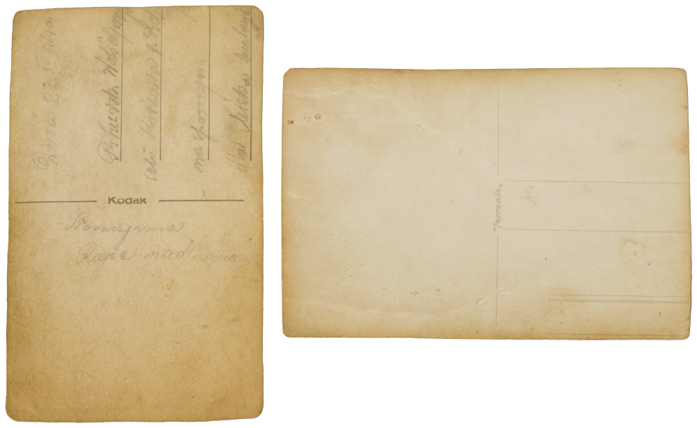A pair of black and white photograph postcards of the same soldier. One postcard has handwriting to the reverse, but neither has been posted.