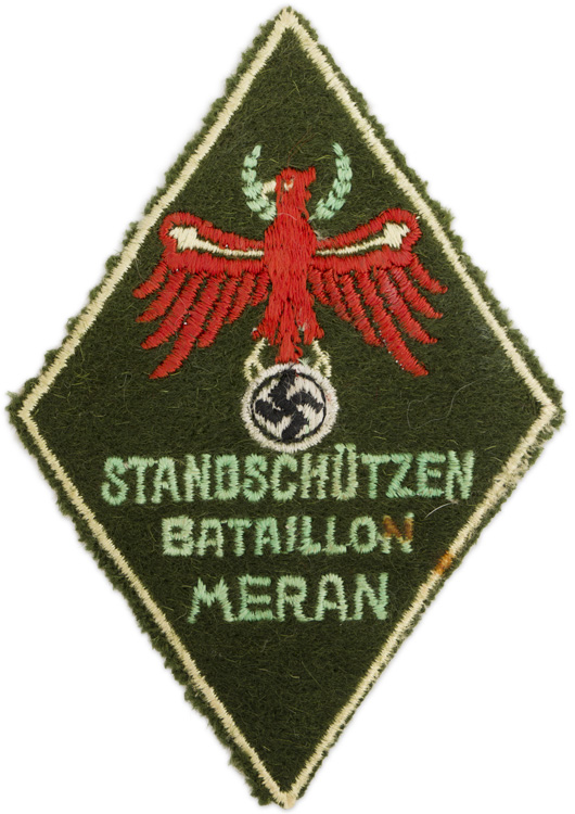 PHYSICAL DESCRIPTION: The insignia consists of a roughly, 10.5cm tall, 7cm wide, dark green wool construction, vertical, diamond base with a machine embroidered, stylized, Tyrolian style eagle in red cotton threads with yellow accents threads and an opened, green laurel leaf wreath flanking its head. The eagle is clutching a black and white bordered, white circle with a central, canted, black swastika. The eagle is positioned above the light green, machine embroidered script, "Standschützen Bataillon Meran". The diamond base has a machine embroidered, fine yellow cotton thread, outer edge border stripe. The reverse of the insignia has a protective white rayon backing panel. Scarce late war, Standschützen Bataillon sleeve insignia.