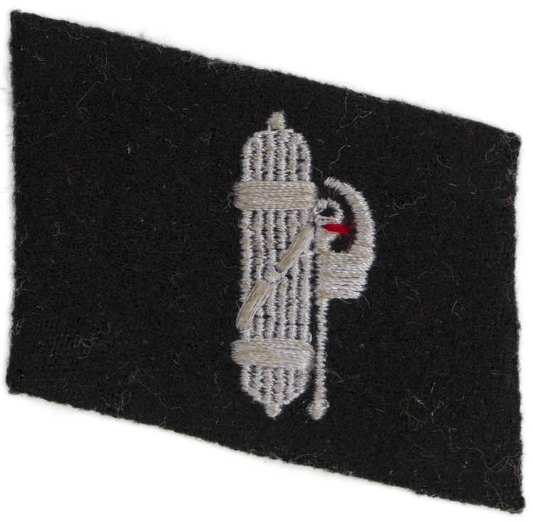 PHYSICAL DESCRIPTION: Black wool construction, right hand side, unit designation collar tab features a machine embroidered, fasces in silvery/grey rayon threads with a small, red, thread accent. The collar tab is mounted on a tan buckram backing.