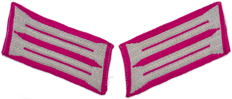 PHYSICAL DESCRIPTION: Machine woven rayon collar tabs with bright silver/aluminum flat wire litzen and interwoven carmine/pink rayon, branch of service and center stripes.