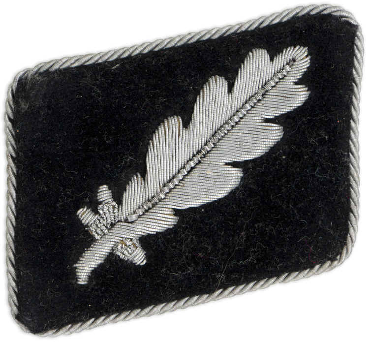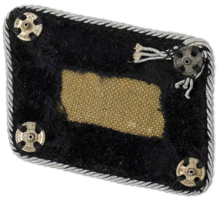 PHYSICAL DESCRIPTION: Second pattern, (circa 1942 1945), black velvet construction SS Standartenführer collar tab features a hand embroidered oak leaf with three small acorns to each in bright silver/aluminum wire threads with bright twisted, silver/aluminum cord piping. The collar tabs is mounted on tan buckram base. Removable type for the summer tunic.