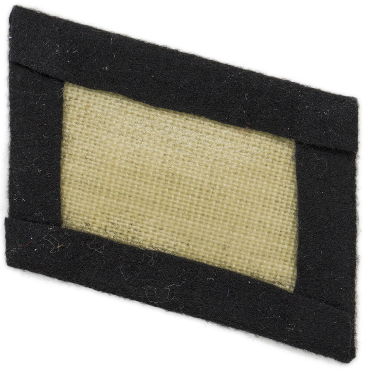 PHYSICAL DESCRIPTION: Third and final pattern, (Circa August 1940 to May 1945), blank, black wool construction left hand side, rank collar tab with no pips, tress, or piping, mounted on a tan buckram base. The collar tab indicates the Waffen SS rank of SS Schütze.