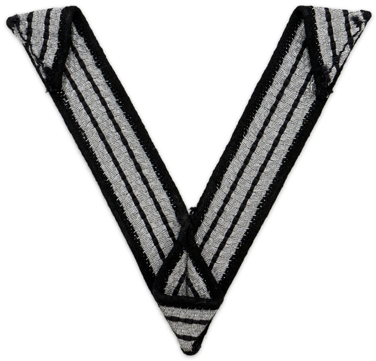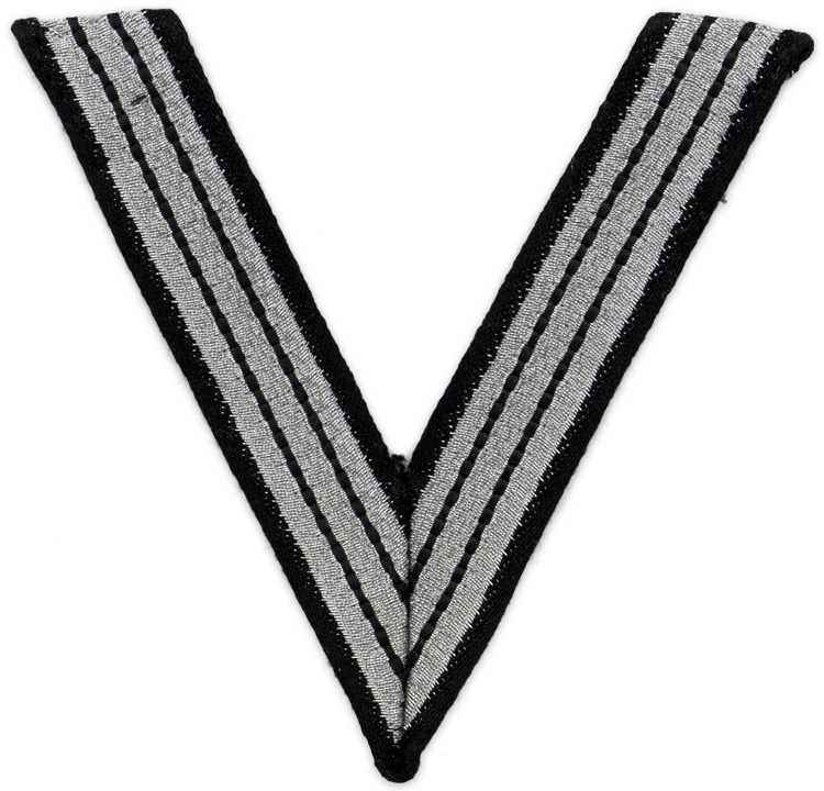 PHYSICAL DESCRIPTION: The insignia consists of a single machine woven, matte silver/grey, waffle patterned, rayon chevron with two interwoven, narrow, parallel black stripes situated near the inside and outside edges. The chevron has black rayon edging with an diagonal pattern.